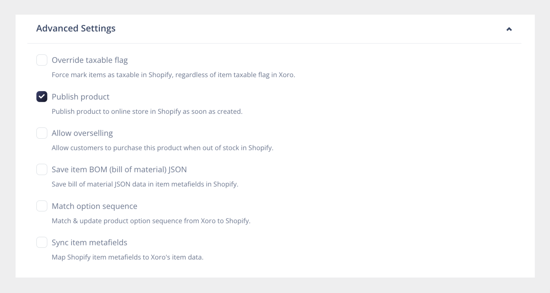 2. **Publish Product**: When enabled, the products are published live on the Shopify store when created in Shopify via Xoro.